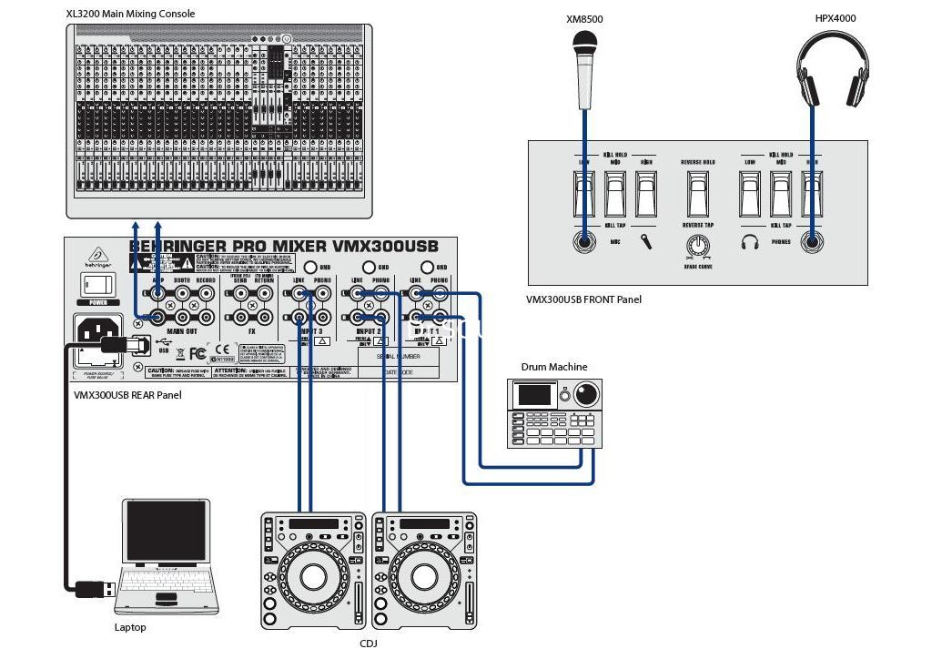 Сервисный центр по ремонту Behringer VMX300USB Behringer VMX300USB DJ-микшер со счетчиком темпа и USB-аудиоинтерфейсом, 3 канала, 3D-surround эффект.