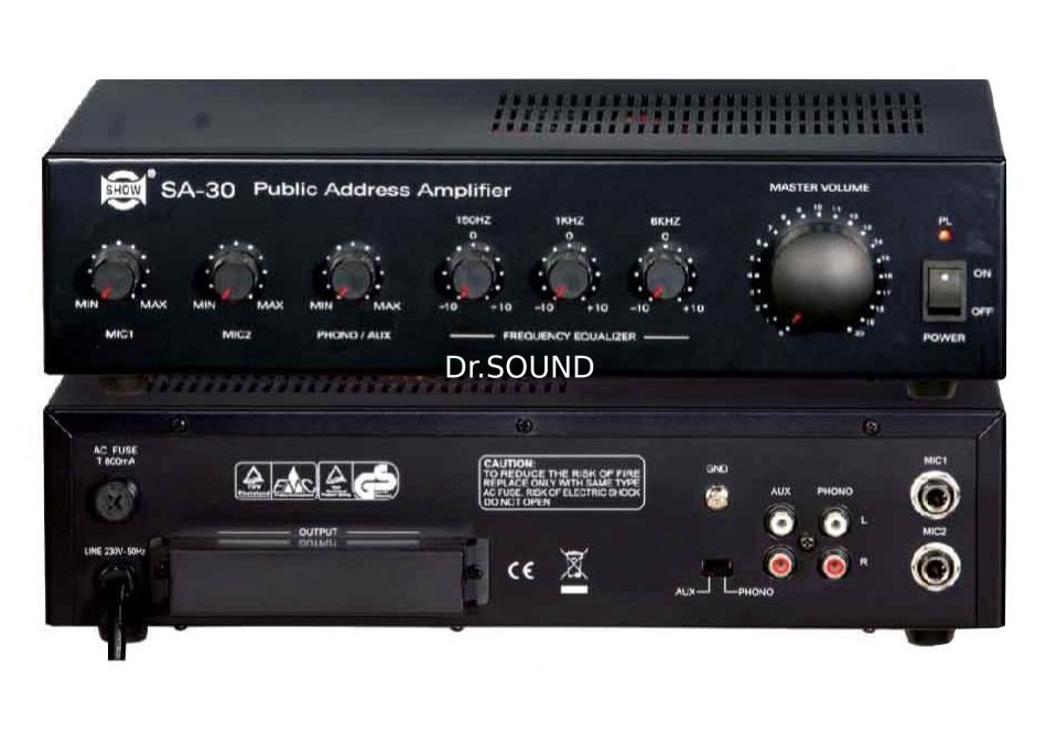 Сервисный центр по ремонту SHOW SA30 Show SA30 - трансляционный усилитель мощности 30 вт, 4/8/16 ом,100 в, 2mic.+1 AUX+1Phone,50Hz~20KHz