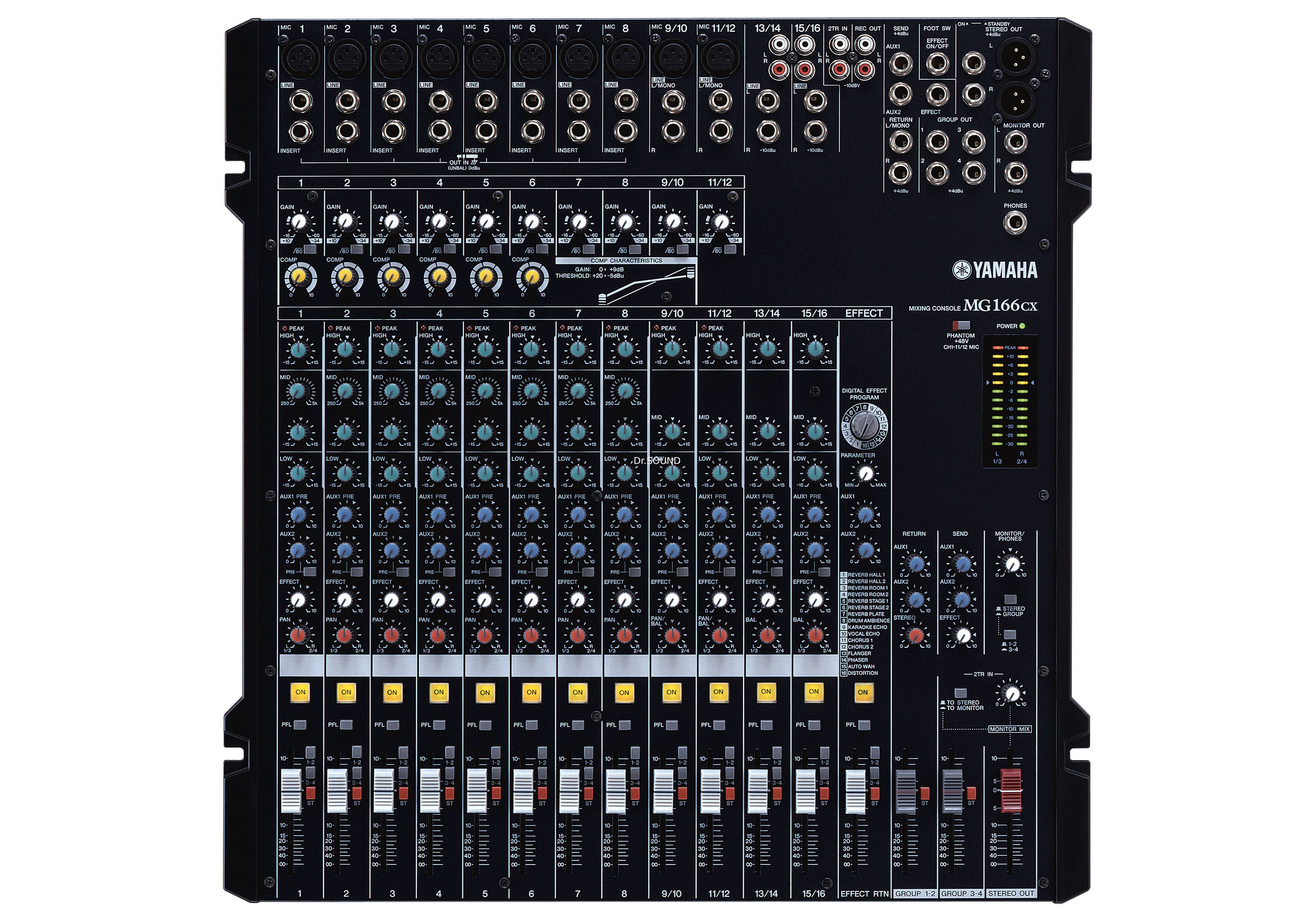 Сервисный центр по ремонту Yamaha MG166CX Yamaha MG166CX - 16 входных каналов, 10 мик./лин. входов, 8 мик./лин. моновходов + 4 мик./лин. стереовходов, 4 шины подгрупп, 3 Aux-шины, 3-полосный EQ, выходная стереошина, процессор эффектов.